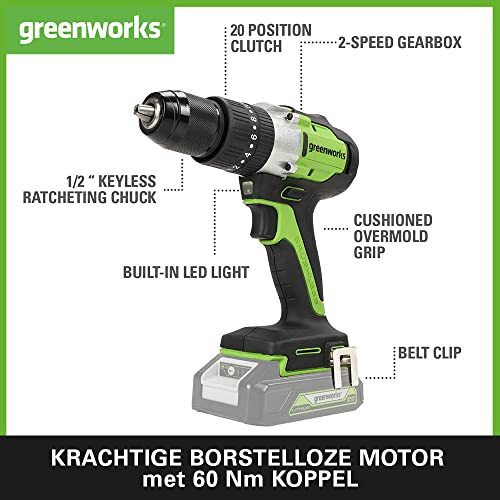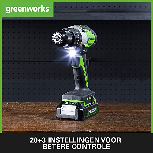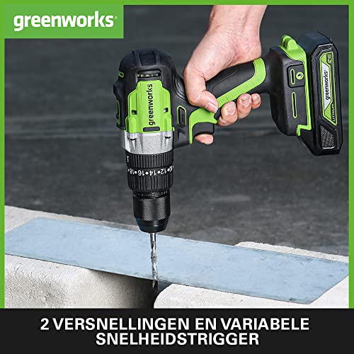 Greenworks GD24DD60K2 Accu Schroefmachine met Borstelloze Motor, 0-1750rpm, 2 Versnellingen, 60Nm Koppel, Draagtas, 24V Accu en Oplader, 3 Jaar Garantie