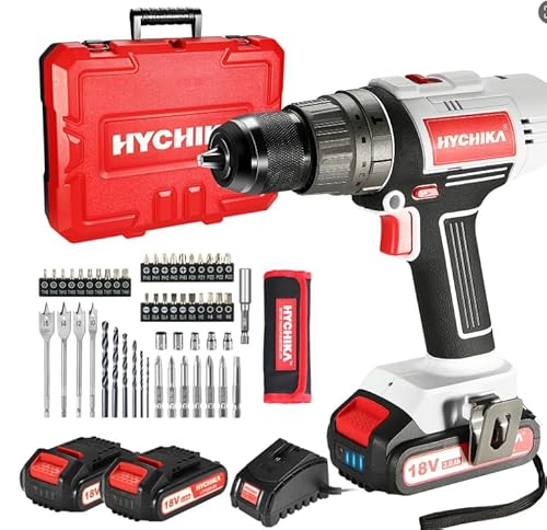 Specificaties: HYCHIKA 18V accuschroevendraaierset, accu-boormachine met 2.0 Ah-accu, klopboormachine max. 45 Nm, 2 snelheden, 21 + 3 koppels, accuboormachine met 53 accessoires, voor reparatie en doe-het-zelf