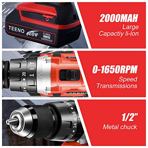 TEENO Visseus Accuboormachine, 2 x 2,0 Ah, batterijen, schroevendraaier, 45 Nm, boormachine, 25 + 3 koppelinstellingen, 69 accessoires + koffer, led, om te knutselen
