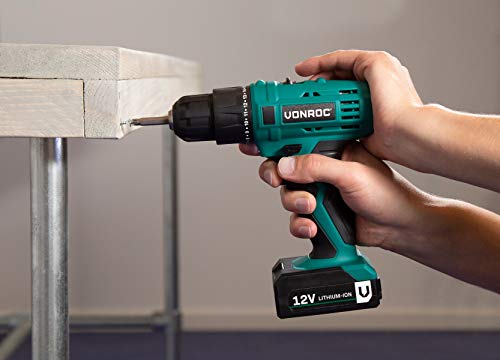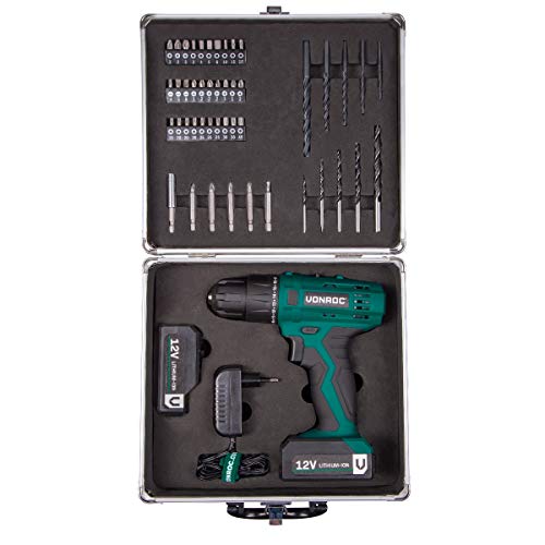 VONROC Accuboormachine, 12 V, in stevige aluminium koffer met 46 accessoires, 2 accu’s en oplader
